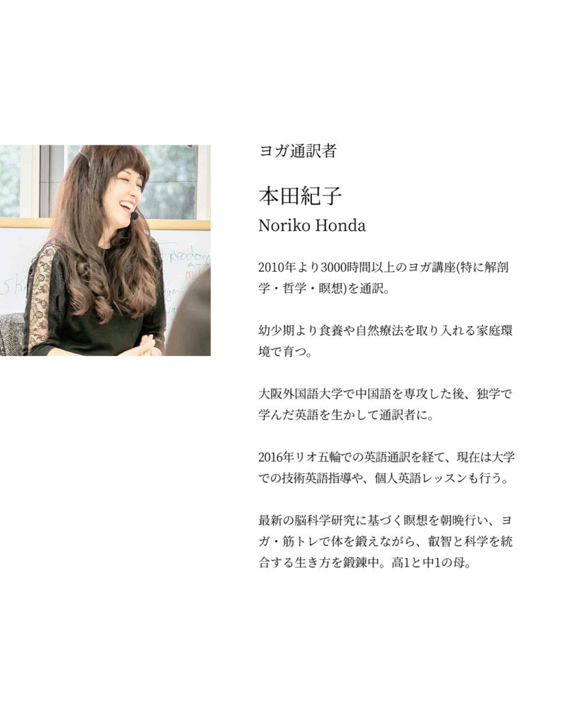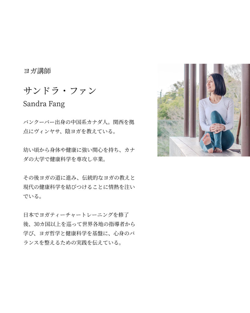 | ヨガ講師 | Sandra Fang(サンドラ・ファン) ※6月のオンライン講義は、本田紀子さんによる通訳付きで行います。 |