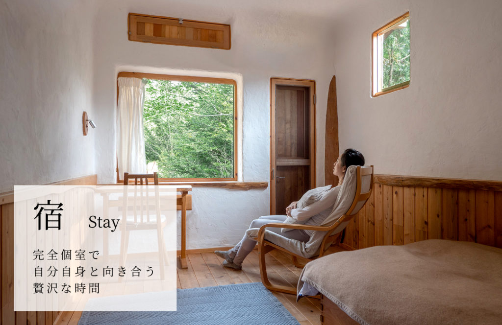 全室個室の静かな環境です。窓の外に広がる雄大な自然を眺めながら、日中の深い学びを整理したり、心身をリフレッシュしたりと、自分自身と向き合う贅沢な時間をお過ごしいただけます。
