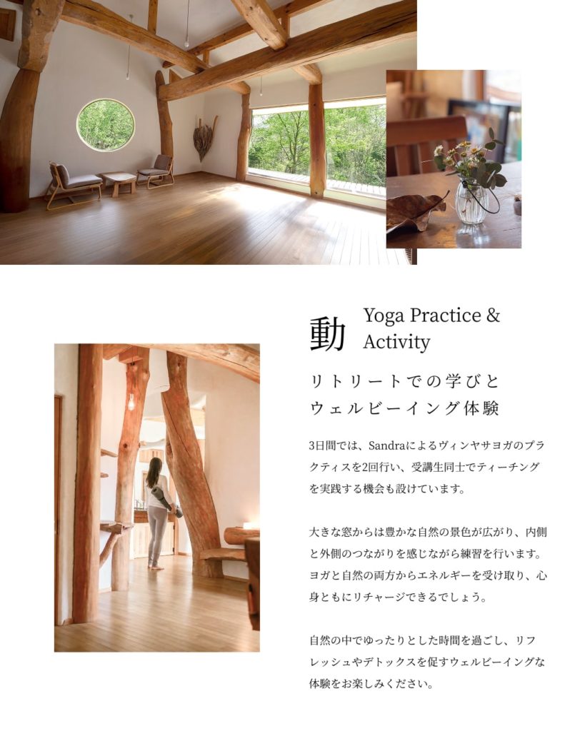 滞在中は自然の中でゆったりと過ごしながら、温泉を楽しみ、体にやさしい植物性の食事を味わいます。また、合計6時間のヨガプラクティスと学びの時間を共に過ごします。受講生同士のつながりを深め、素敵な仲間と出会う機会にもなるでしょう。